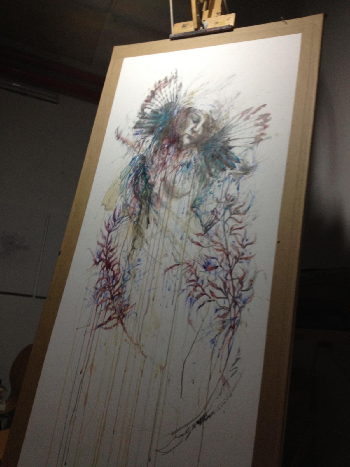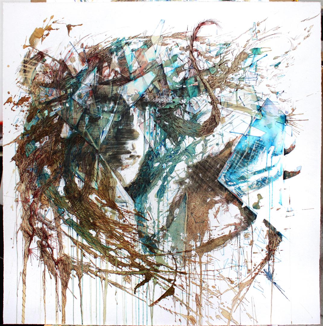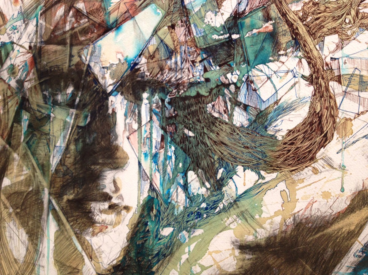 The exhibition at Ink’d is the biggest collection of work I have shown to date and also the most focused. The workreflects on a hectic 2012 and is a reaction and contemplation of events that have had an effect on the early part of this year. I won’t lie.. it’s been a tough time, emotionally it has been a roller coaster year with massive highs, and some really difficult times too. The work reflects this quite openly. The shards of glass that are prominent in this collection of work developed from the falling thorns in the piece one for sorrow which hangs at the back of the gallery at Ink’d. The increased chaos and noise in the work is elevated too.