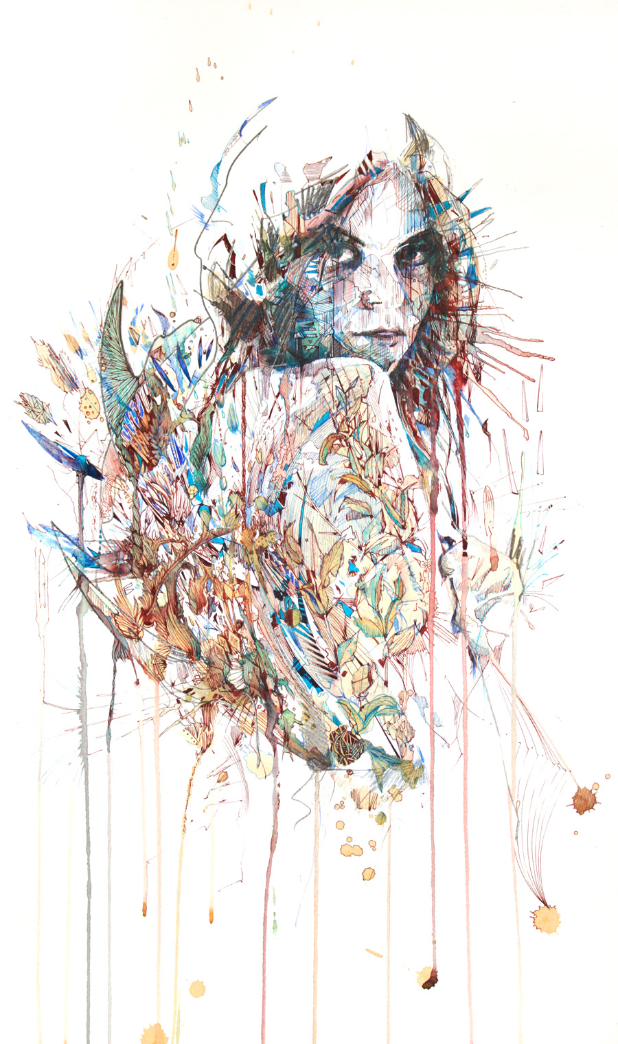 ‘The Mortal Coil’ challenges us to look at our own time and existence – the brevity of our time on this planet, the place we hold among our surroundings and our connections with the natural world, as the painting pulses revealing a skull beneath the layers it reminds that we are flesh and bone,it challenges us to appreciate our short time, to make the most of our existence. In ‘Knowledge is Power’, ‘Trouble’, Brave new world and ‘Protection’ I want the viewer to look at the possibilities and opportunities that arise from a single moment – each work references the image ‘I and Love and You’ by photographer Michael Färber. Each image searches the subject for a different story, chaos plays it’s part again and these works are an example of the approach taken to painting – allowing chaos and chance to dictate the outcome.