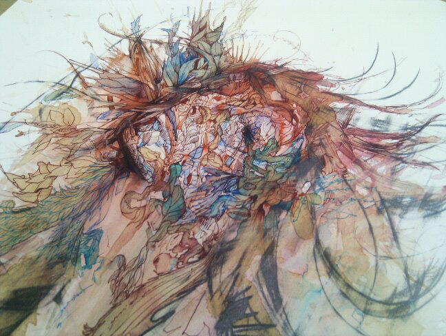 The exhibition at Ink’d is the biggest collection of work I have shown to date and also the most focused. The workreflects on a hectic 2012 and is a reaction and contemplation of events that have had an effect on the early part of this year. I won’t lie.. it’s been a tough time, emotionally it has been a roller coaster year with massive highs, and some really difficult times too. The work reflects this quite openly. The shards of glass that are prominent in this collection of work developed from the falling thorns in the piece one for sorrow which hangs at the back of the gallery at Ink’d. The increased chaos and noise in the work is elevated too.