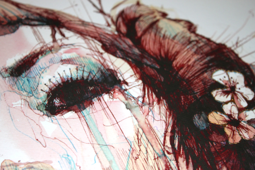 There is a very fine balance in the work between complete freedom, and the constraints put on the work by figurative elements.  A particular piece which I think achieved this was ‘Another Place’ created just before the journey exhibition.  Following on from the works ‘somewhere’ and ‘somewhere else’ the piece focuses on that moment where we allow ourselves to delve inside our unconscious mind, to drift and yet still have some lucid recollection of events, or an awareness of self.  In this respect ‘Another Place’ is, in effect, a drawing of my drawing process – it calls upon personal symbols and shapes important to me and transposes them alongside an image of a daydreaming figure.  The model reference for this piece is photographer Lisa Stefaniak lisastefaniak.com I asked Lisa if I could reference images from a series of photographs she had taken each day over a period of one year.  There is something about the set which gives this feeling of elsewhere – a daydream or a longing and this is what I am trying to capture through a sense of abandonment in drawing.