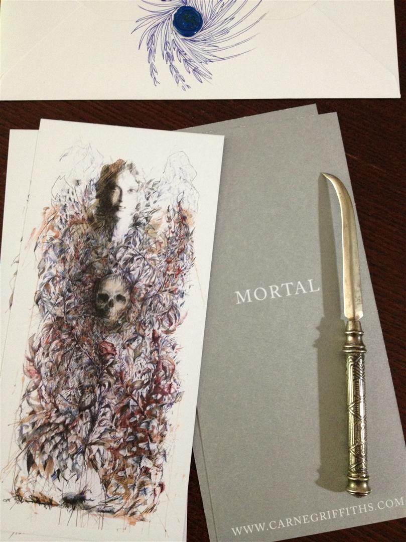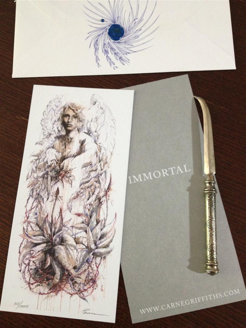 Each Postcard Pack, contains 4 images from Carne Griffiths, printed on 350gsm matt card, each individually signed and numbered by hand, comes sealed in a cellophane envelope as part of a limited edition of 250 packs.