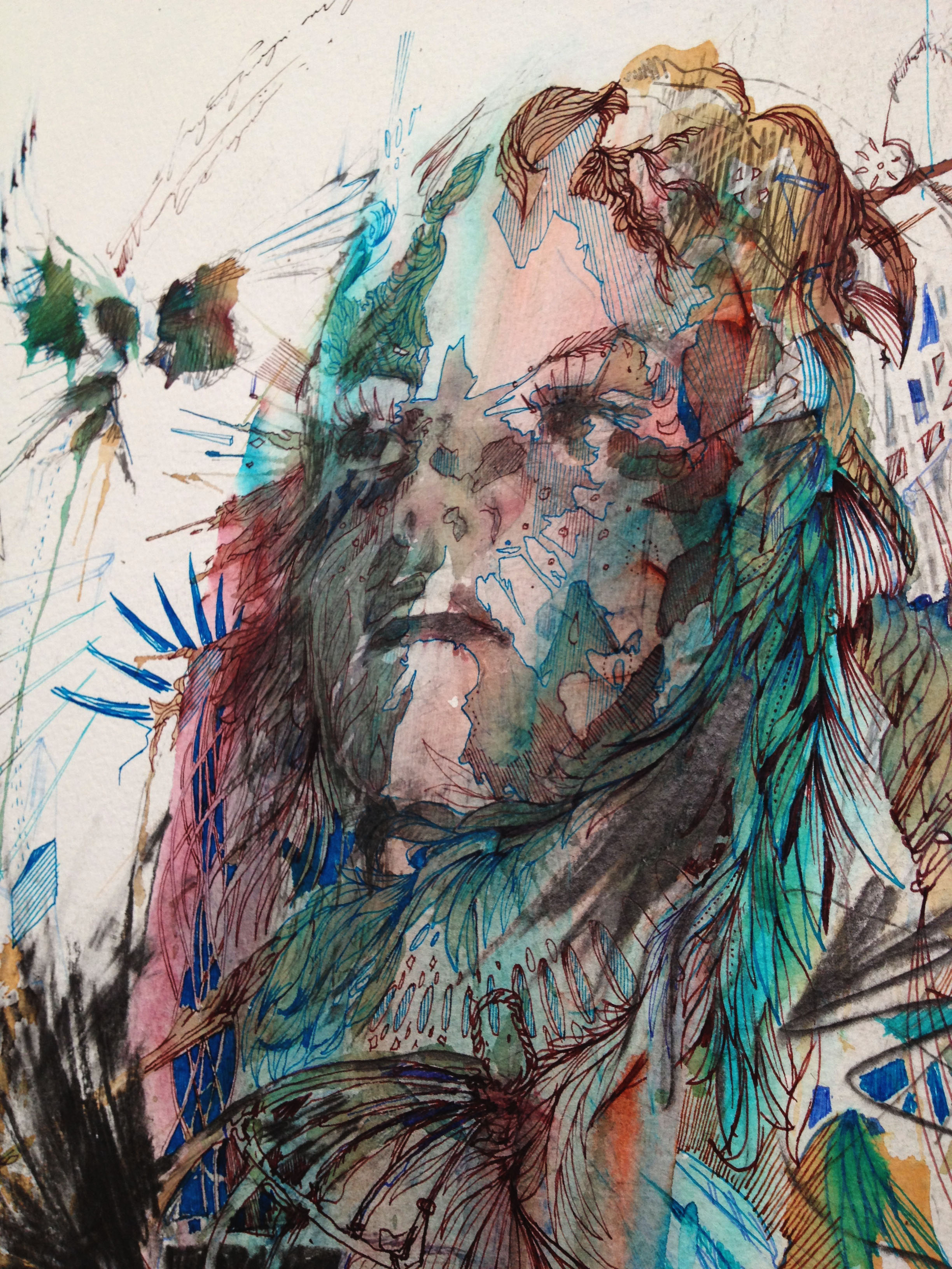 ‘The Mortal Coil’ challenges us to look at our own time and existence – the brevity of our time on this planet, the place we hold among our surroundings and our connections with the natural world, as the painting pulses revealing a skull beneath the layers it reminds that we are flesh and bone,it challenges us to appreciate our short time, to make the most of our existence. In ‘Knowledge is Power’, ‘Trouble’, Brave new world and ‘Protection’ I want the viewer to look at the possibilities and opportunities that arise from a single moment – each work references the image ‘I and Love and You’ by photographer Michael Färber. Each image searches the subject for a different story, chaos plays it’s part again and these works are an example of the approach taken to painting – allowing chaos and chance to dictate the outcome.